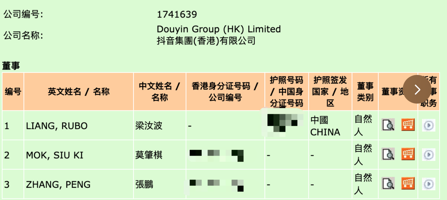 新京报贝壳财经讯(记者白金蕾)5月8日,新京报贝壳财经记者通过查询香港公司网上查册中心独家获悉,2012年注册成立的字节跳动(香港)有限公司已经于今日更名为抖音集团(香港)有限公司,该公司旗下共有三位董事,分别为字节跳动CEO梁汝波、莫肇棋和张鹏,公司性质为私人股份有限公司。