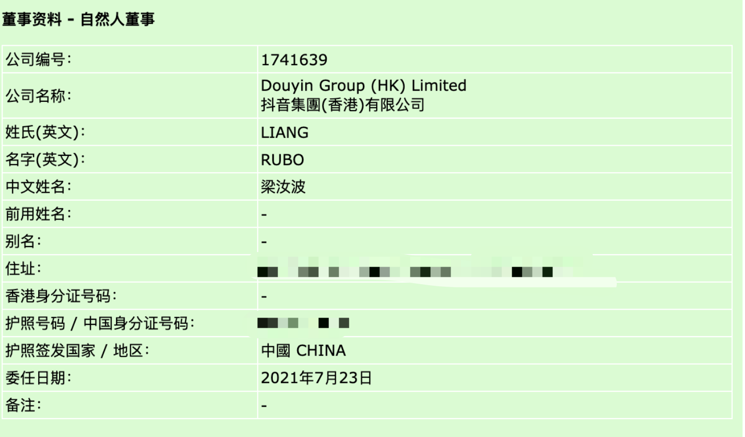 上述查册网站显示,梁汝波的委任日期为2021年7月23日,使用中国籍护照登记。去年5月,字节跳动创始人张一鸣宣布卸任CEO,梁汝波接任,全面负责该公司的整体发展。