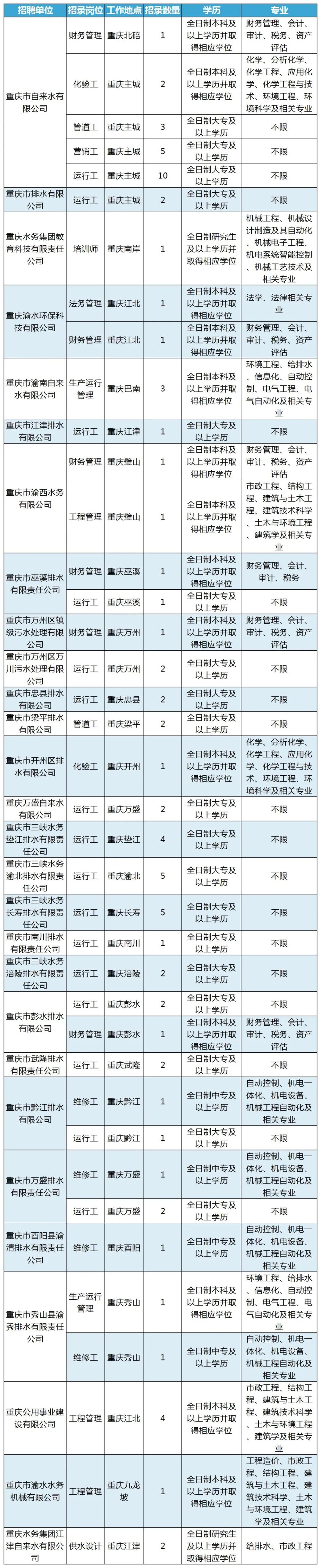 重庆水务环境集团所属单位——重庆水务集团股份有限公司为适应改革发展需要,进一步改善人才结构,形成合理、科学的人才梯队,实现高质量可持续健康发展,现面向2022届全日制大专及以上学历(偏远地区维修工岗位除外)且具有扎实专业功底和较高综合素质的优秀应届毕业生实施招聘工作。重庆水务集团股份有限公司是一家集产业投资、建设、运营与专业技术服务于一体的国内领先、国有控股的专业水务综合服务商,2010年在上海证券交易所整体上市,股票名称:重庆水务,代码:601158。公司专注于城市供水、污水处理和污泥处理处置等水务环保产业的投资、建设和运营管理,现有30家全资及控股子企业和6家合营、联营公司,业务涵盖城镇供水、污水、中水、污泥、水环境综合治理、科技服务、环保装备等领域,拥有重庆市主城区88%供水市场和全重庆82%污水处理市场,业务延伸至四川、湖北、云南、河南等地,总资产285.55亿元,净资产164.33亿元,资产负债率42.19%。