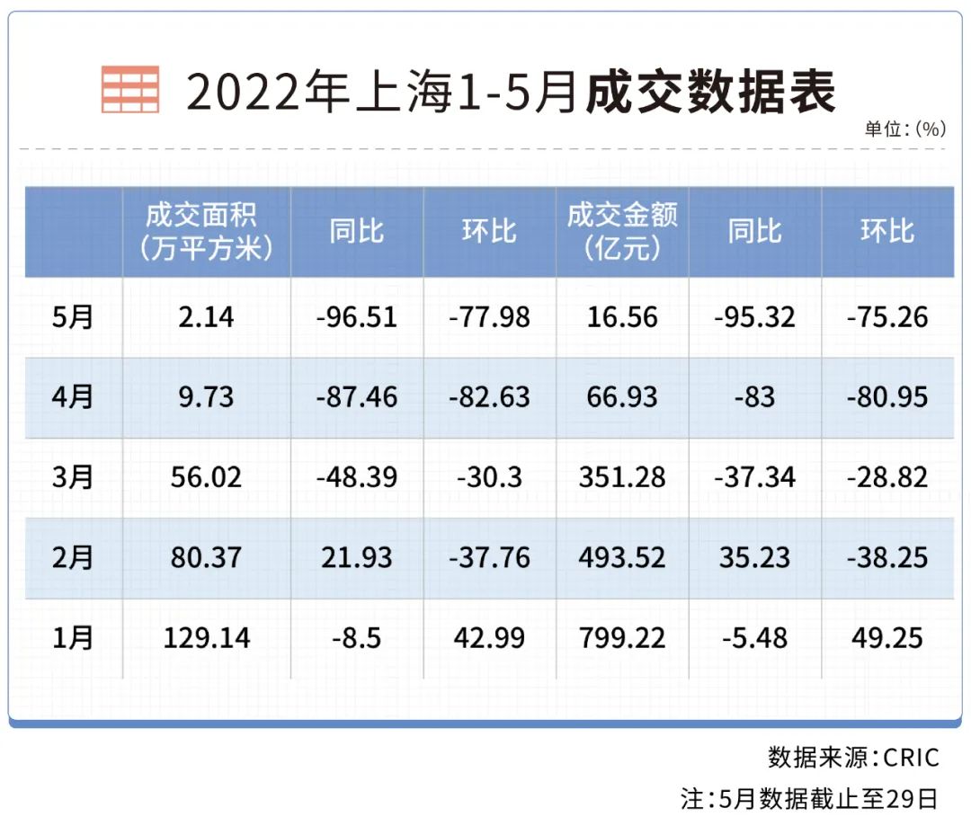 从房地产市场来看,4月新房供应环比减少97%,同比减少97%,成交面积环比减少83%,同比减少87%,5月成交陷入低谷,截止至2022年5月29日,5月新房成交2.14万平方米同比下降96.51%,在4月跌8成的基础上进一步环比下降77.98%,受其影响,整个长三角地区成交同样惨淡。