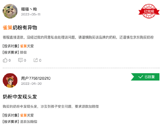 而仅半个月前,#900克雀巢奶粉连罐称仅512克#再一次登上热搜。黑猫投诉【投诉入口】上,雀巢的投诉量为408起。消费者的投诉内容主要集中在产品变质、产品内有异物等。