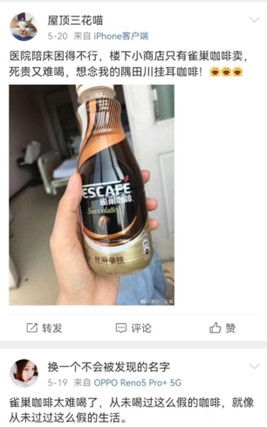 但是雀巢似乎仍然没有得到年轻人的喜爱,微博上,有不少人吐槽雀巢咖啡难喝,有人自嘲到“自己手磨咖啡比雀巢咖啡还难喝”,有人用“只能喝雀巢”来表示生活的不如意、有人用雀巢咖啡比喻药的口感:“自从尝了一口百香果味的雀巢咖啡,我宣布藿香正气水也能接受了!”