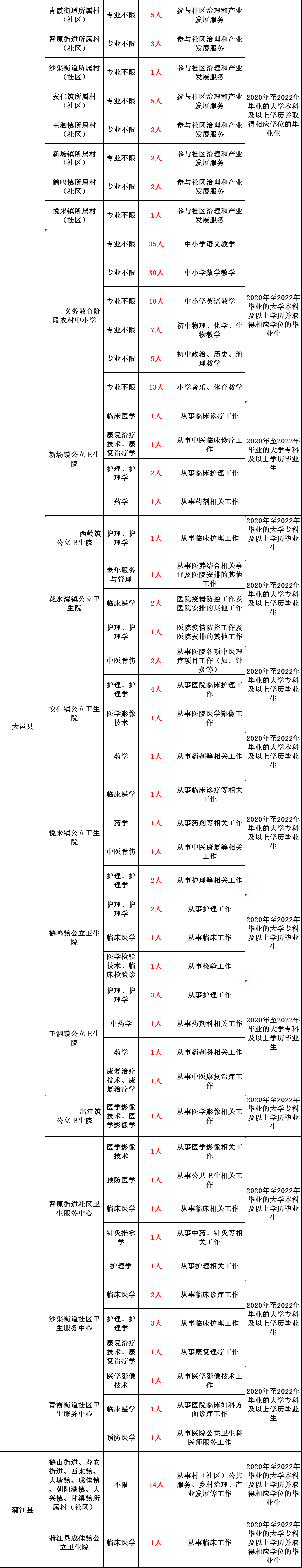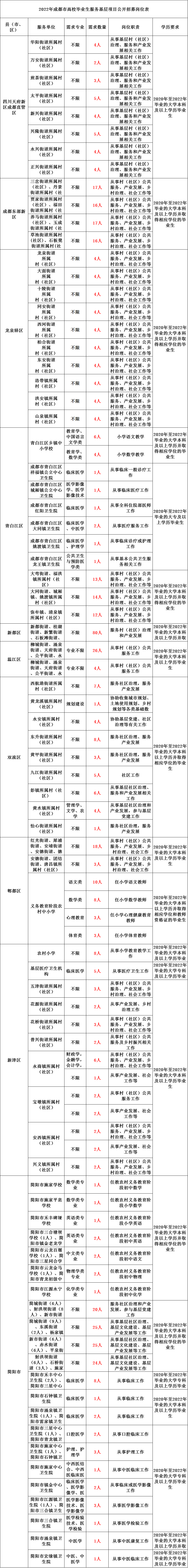 2022年成都市高校毕业生服务基层项目拟公开招募1158名大学生志愿者到城乡基层服务,具体岗位详见《2022年成都市高校毕业生服务基层项目公开招募岗位表》。