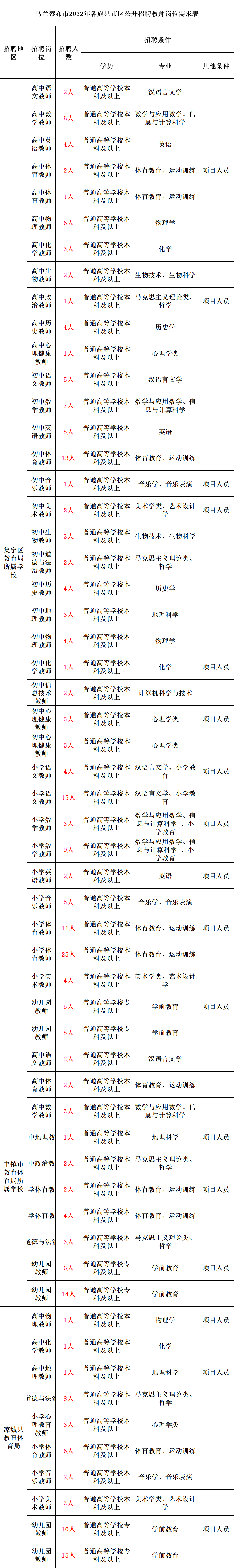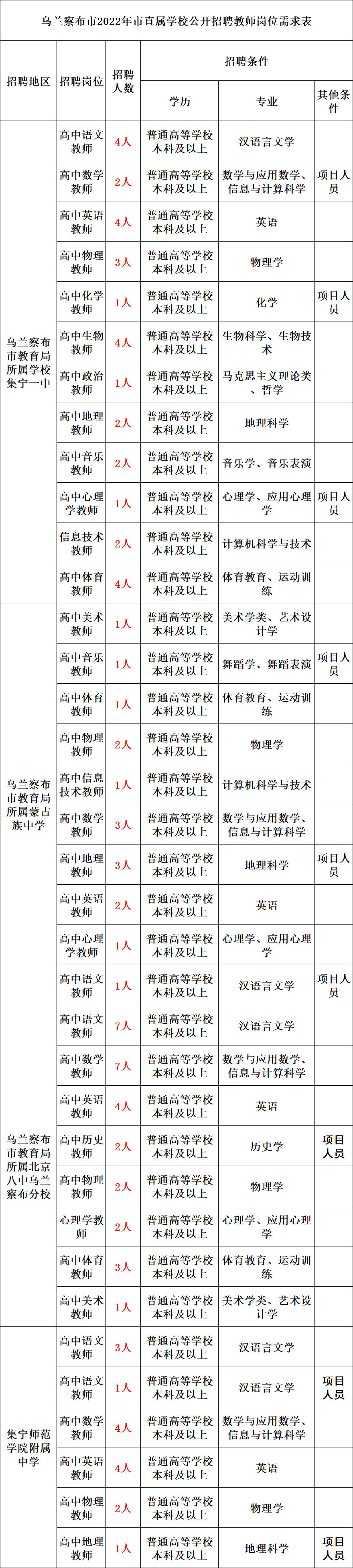 (一)招聘岗位及人数详见附件《乌兰察布市2022年公开招聘教师岗位需求表》(以下简称《岗位需求表》)。