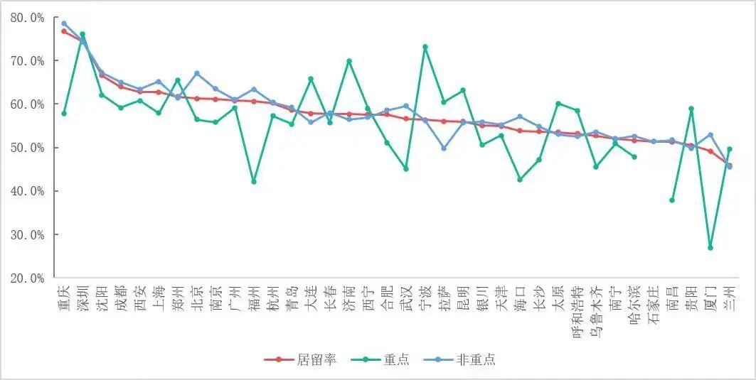 值得注意的是,重庆和成都的毕业生居留率分别为76.7%、63.9%,分别排在第一、第四位。但是,两地面临的共同问题是重点院校居留率表现不佳,分别仅为57.7%、59.1%,都在十名开外。