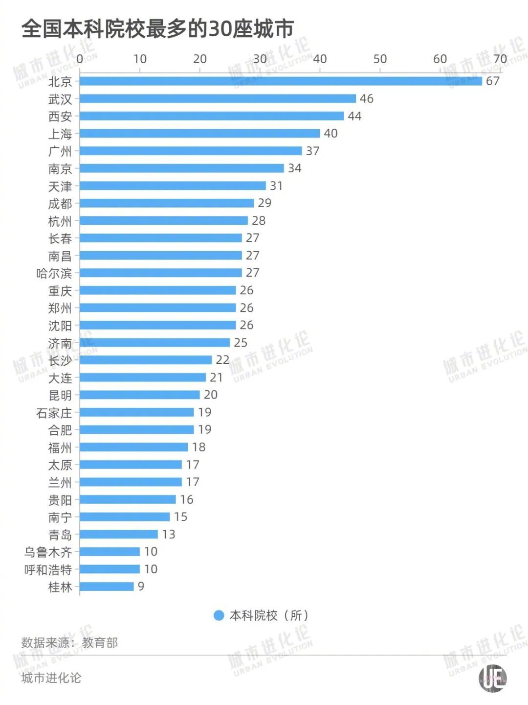 单看本科院校,北京(67所)、武汉(46所)、西安(44所)位列全国前三,上海(40所)、广州(37所)、南京(34所)、天津(31所)、成都(29所)、杭州(28所)、哈尔滨(27所)、南昌(27所)及长春(27所)同样位居前列。