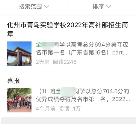在化州市青鸟实验学校认证的公众号里,一篇标题为“化州市青鸟实验学校2022年高补部招生简章”的文章显示,“全某某同学以高考总分694分勇夺茂名市第一名(广东省第16名)”;在标题为“喜报”的文章显示,“(1)班全某某同学以704.5分优异成绩夺得茂名市第一名。”