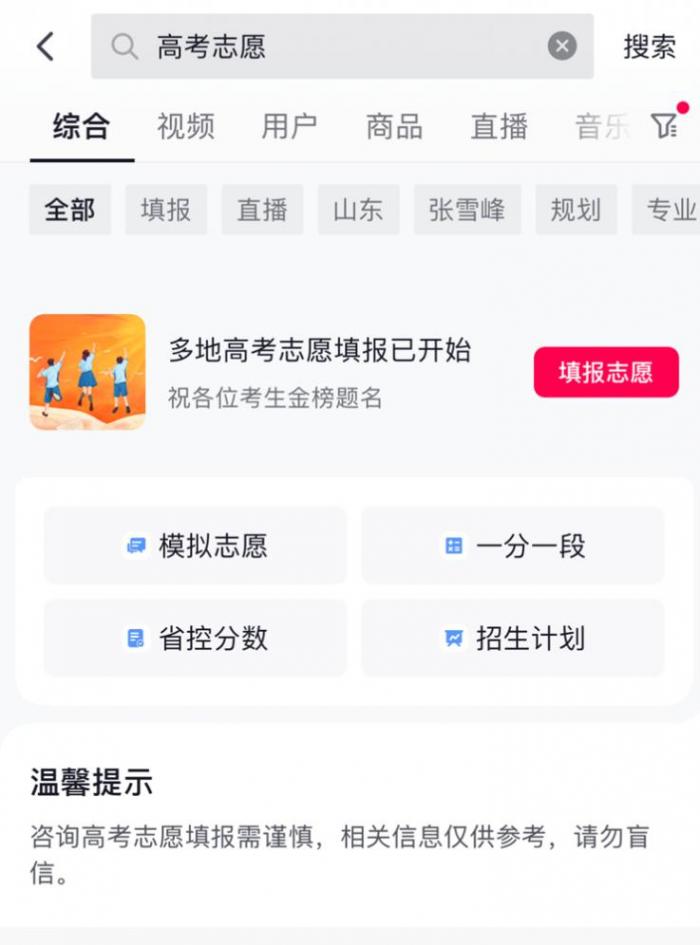 此外,抖音还表示,除正规出版书籍外,平台也禁止出售与高考志愿填报相关的其他商品,包括但不限于“高考志愿卡”、“高考志愿培训类课程”等。同时,禁止对“高考志愿规划师”相关内容进行广告投放,并上线温馨提示:“咨询高考志愿填报需谨慎,相关信息仅供参考,请勿盲信。”