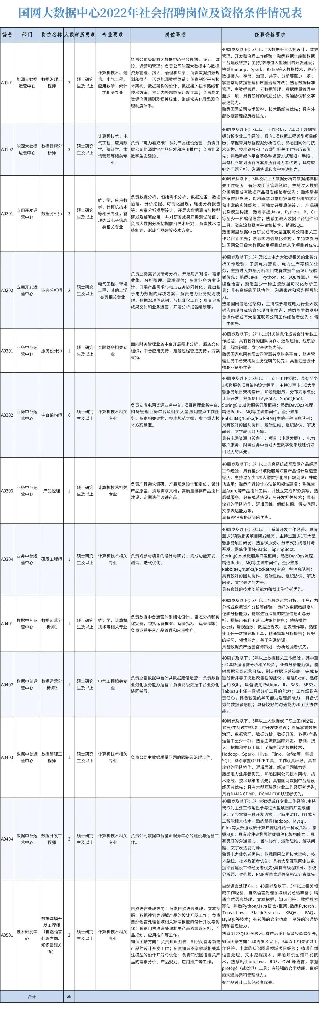 根据工作需要,面向社会公开招聘核心业务岗位13个共28人,全部为在京岗位。招聘录用后,与国网大数据中心签订劳动合同。
