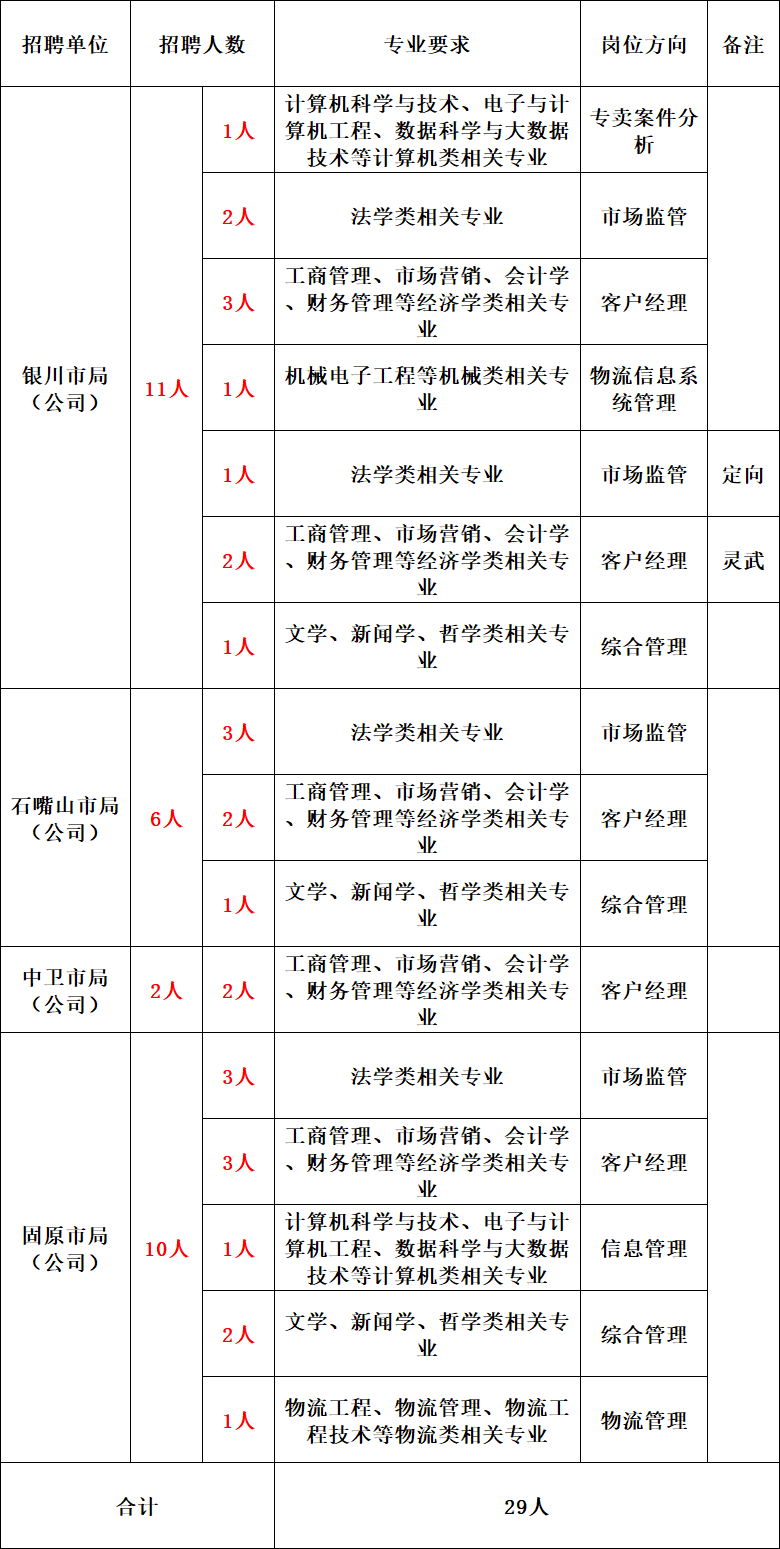 宁夏区烟草专卖局(公司)成立于1983年10月,目前下辖银川、石嘴山、吴忠、固原、中卫5家地市局(公司),永宁、贺兰、灵武等22家县局(分公司)。主要从事烟草专卖行政管理及执法监督、卷烟经营和综合管理等业务。为进一步加强人才队伍建设,优化人员结构,根据人力资源需求和工作需要,拟面向社会公开招聘29名大学本科及以上学历应届毕业生。现将有关事项公告如下: