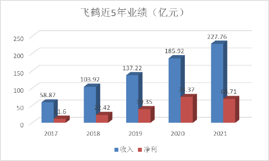 随着2008年三聚氰胺事件发生,国产奶粉集体陷入了信任危机,外资品牌奶粉长期霸占国内奶粉前列,不过,在2016年前后,中国飞鹤异军突起,销售额从2017年不足60亿,一路增到2021年的200多亿。
