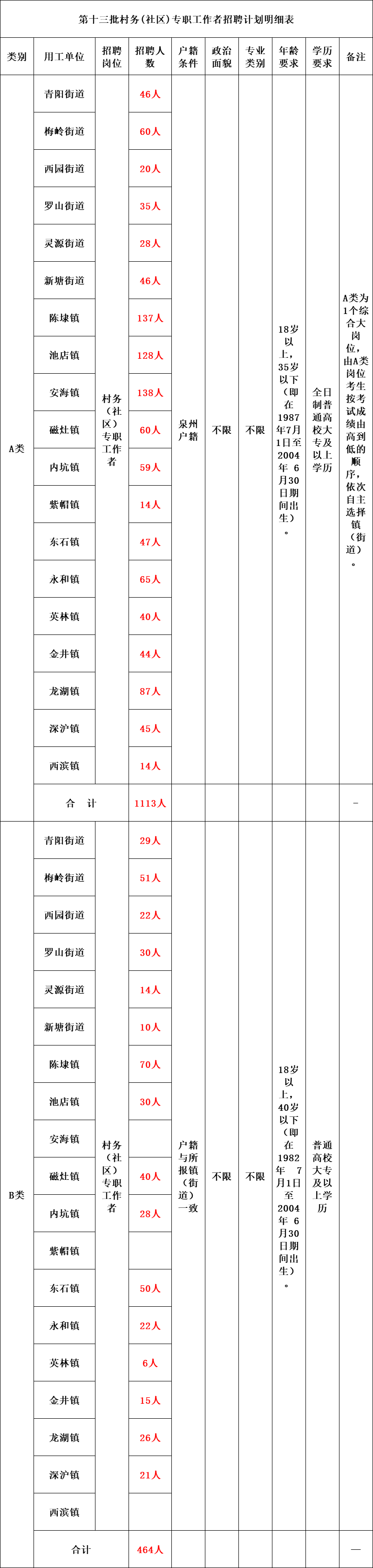 本次计划招聘村务(社区)专职工作者1577名,其中:A类岗位计划招聘1113名;B类设岗位16个,计划招聘464名。