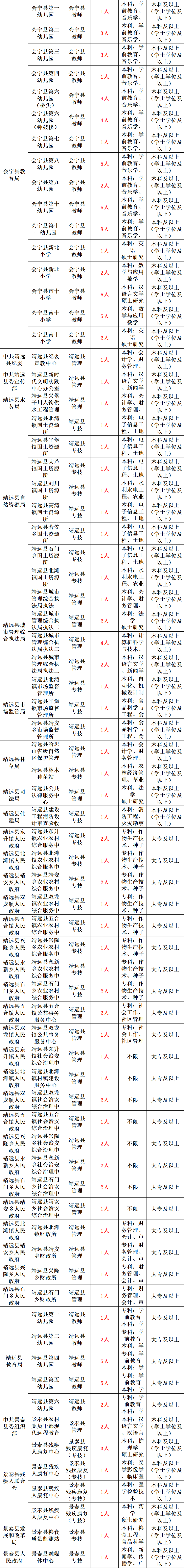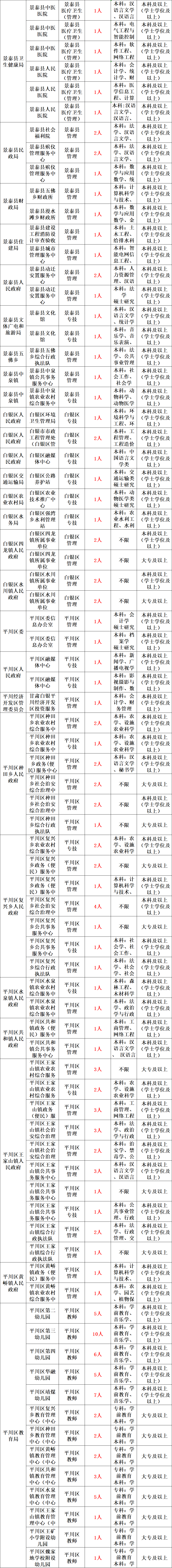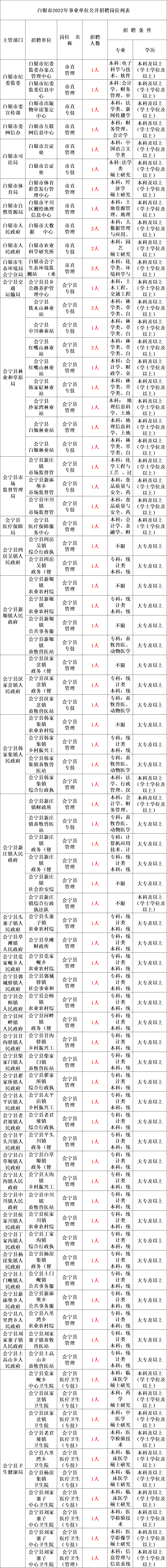 全市公开招聘事业单位工作人员359名,其中:市直14名、会宁县121名、靖远县72名、景泰县33名、白银区15名、平川区104名。具体招聘计划详见《白银市2022年事业单位公开招聘岗位列表》(以下简称《岗位列表》)。