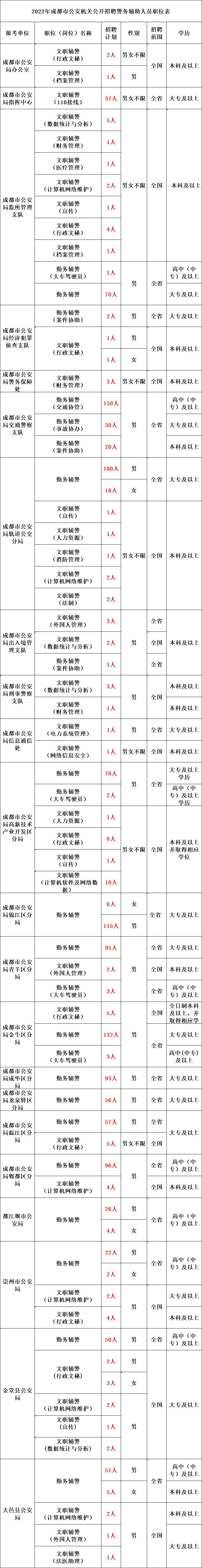 依据《四川省公安机关警务辅助人员管理办法》(四川省人民政府第345号令)《成都市公安机关警务辅助人员管理办法(试行)》(成公发〔2017〕82号)《成都市公安机关警务辅助人员招聘办法(试行)》(成公通〔2018〕62号)的相关规定,根据工作需要,成都市公安机关面向社会开展2022年警务辅助人员招聘工作,现将有关事项公告如下。