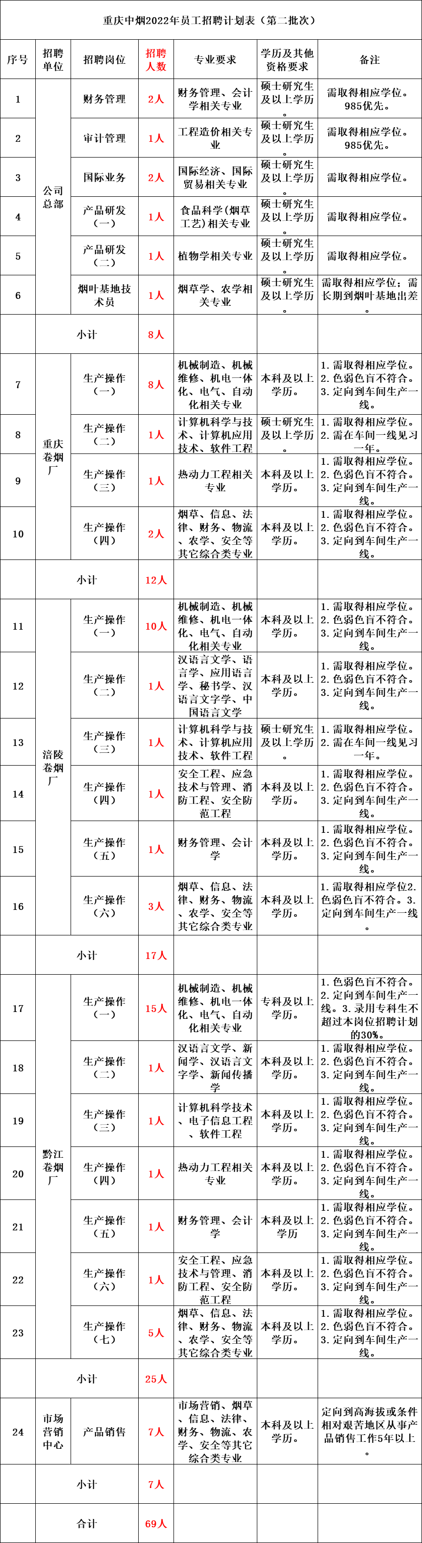 公司本次公开招聘人数为69人,招聘单位、岗位及资格要求见附件《重庆中烟2022年招聘计划表》。