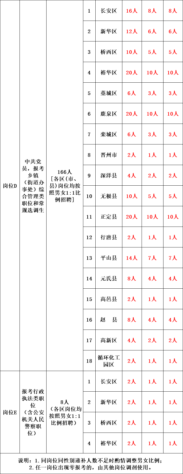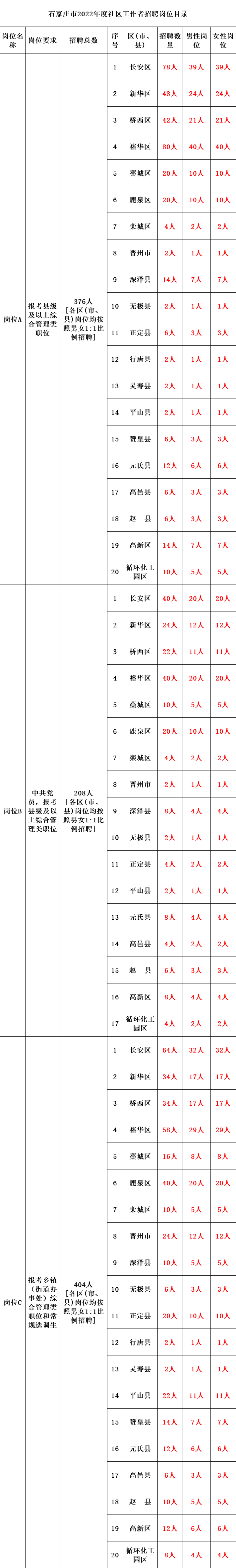 2022年度石家庄市社区工作者公开招聘共设5个岗位,计划招聘1162名,其中,男性岗位、女性岗位各581人。岗位信息详见《石家庄市2022年度社区工作者招聘岗位目录》(附件1)。