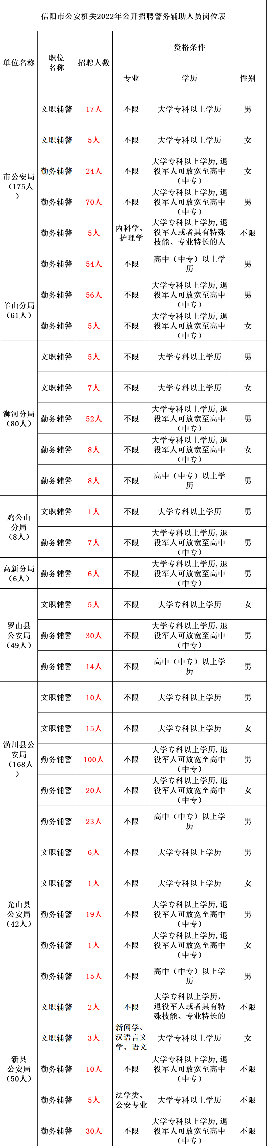 本次招聘辅警639名,其中市公安局175名,城区分局155名,县级公安机关309名,具体名额、招聘岗位及有关要求详见职位表。
