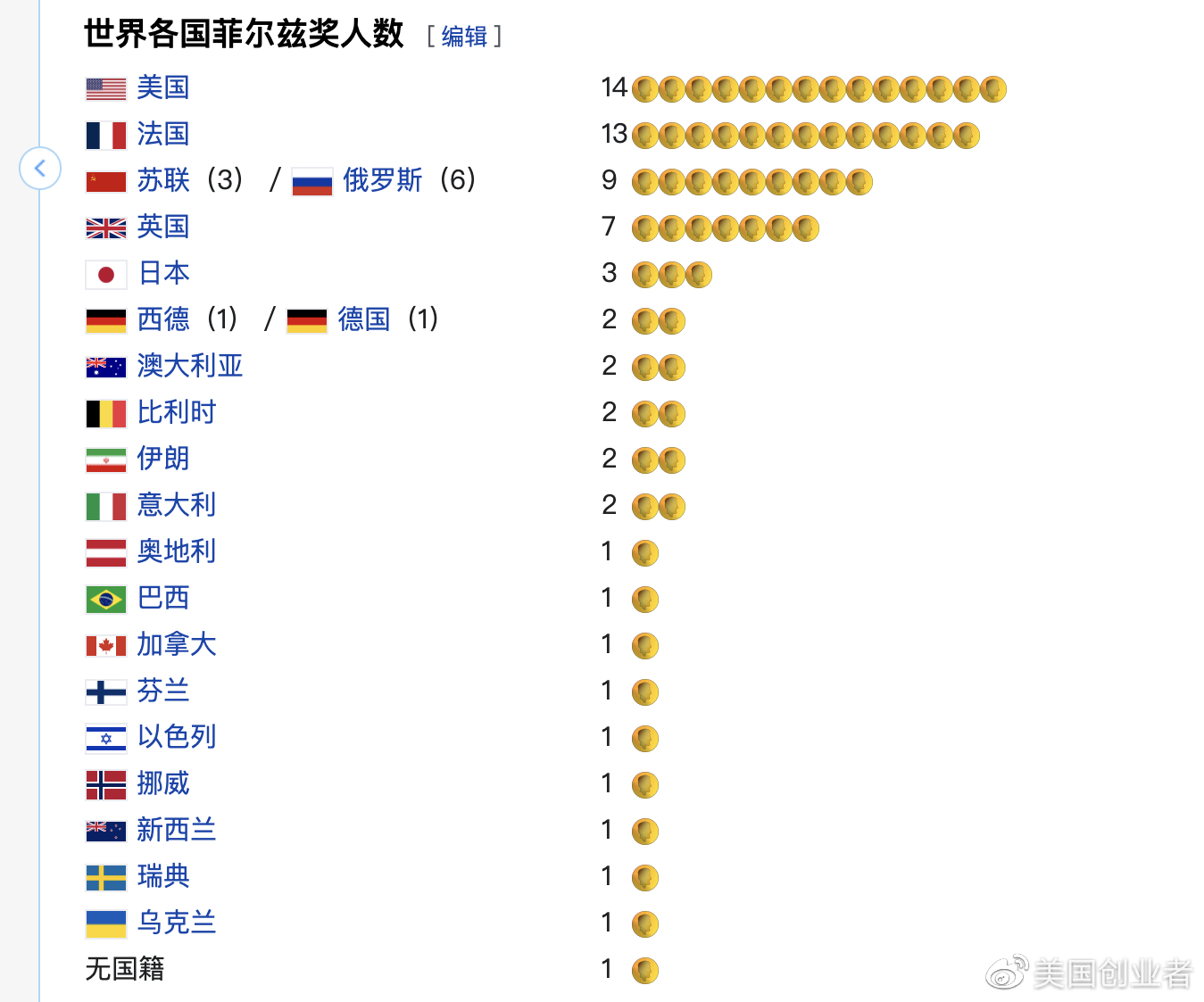 世界各国菲尔兹奖的获奖人数,暂时没有中国的