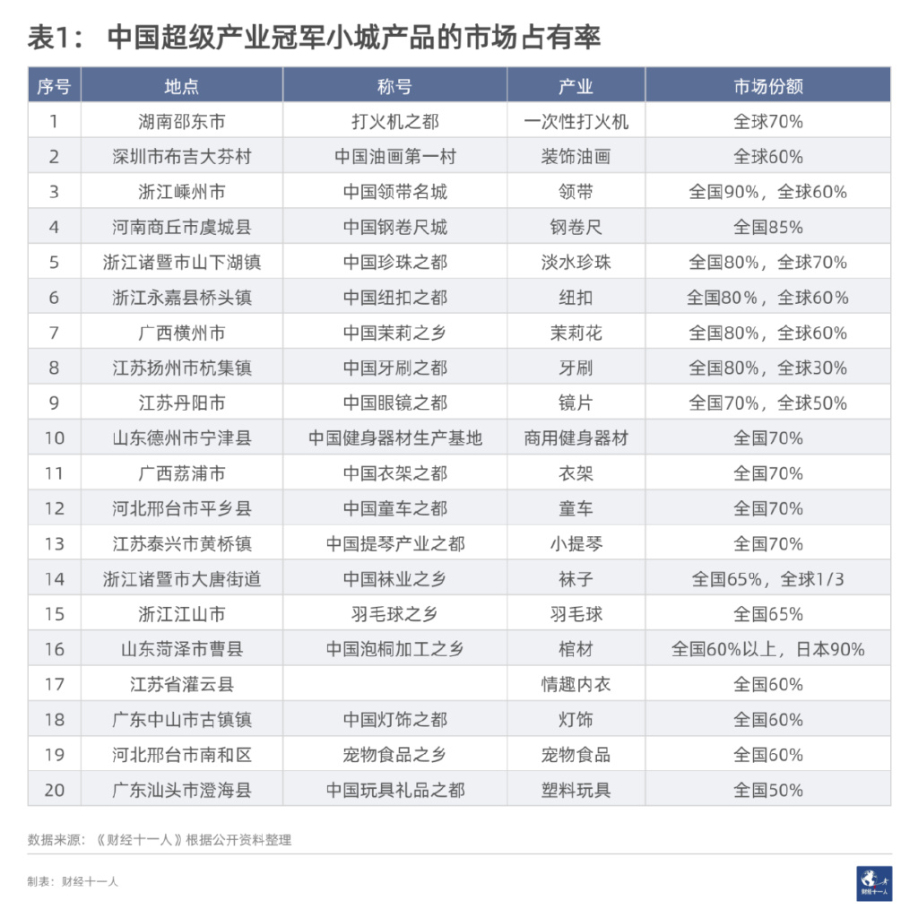 中国有很多神奇的小城,比如县城或小镇,几万人从事同一个小产业。产业虽小,但其产量可以占到中国50%以上,有些甚至占到世界的50%以上。可以说这些小城是中国的超级产业冠军(见表1)。