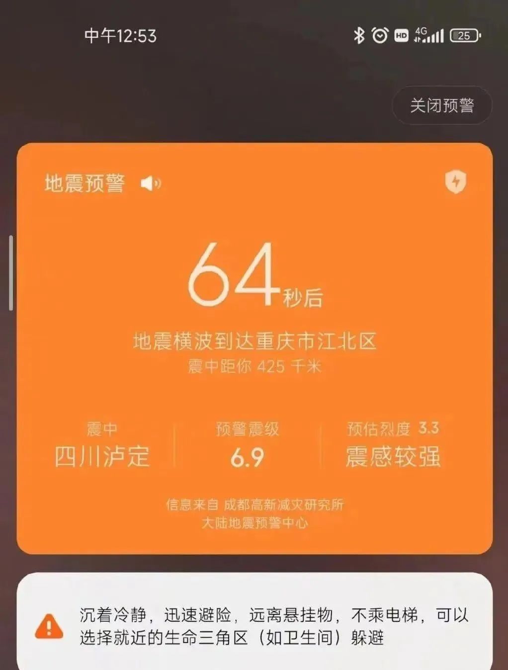 9月5日12时52分,四川甘孜州泸定县发生6.8级地震。有不少媒体报道,地震发生前,四川、重庆居民发了自己手机中的地震预警,其中一名重庆网友预警截图显示,“64秒后地震横波到达重庆市江北区,震中四川泸定,预警震级6.9级,震感较强。”