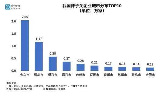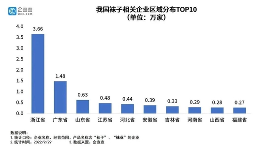 截至2022年9月29日,浙江袜企数量排在全国第一。/企查查