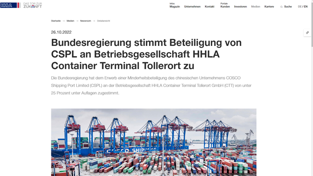 公开资料显示,2021年9月,中远海运集团子公司中远海运港口表示,计划以6500万欧元收购德国汉堡港CTT码头的35%股权。一年多来,对于这一收购案,德国联邦政府内部意见并不统一,甚至传出了要否决该收购案的消息。但德国总理府、汉堡地方政府始终力排众议,选择站在德国企业界一边,有意推动收购案在10月底完成。