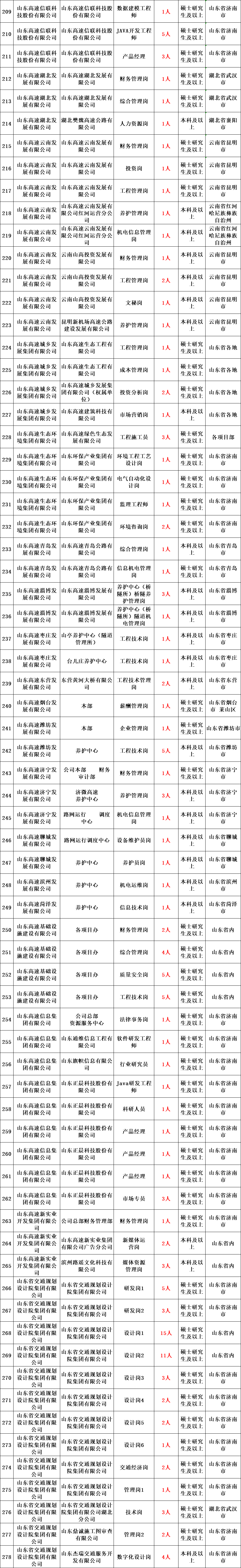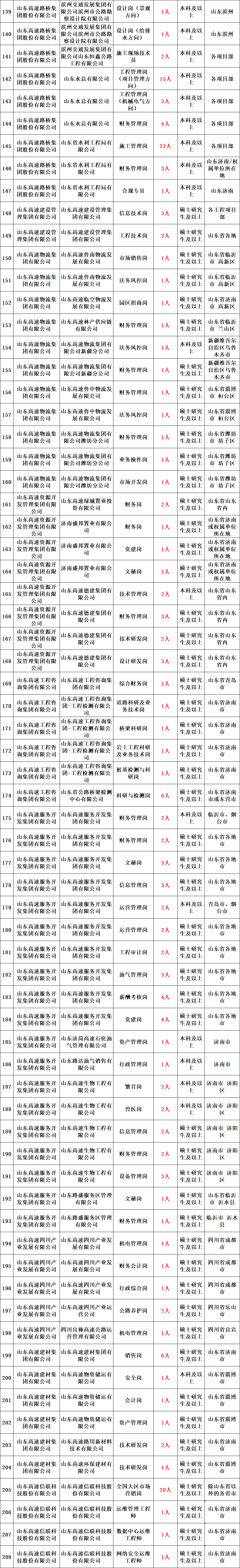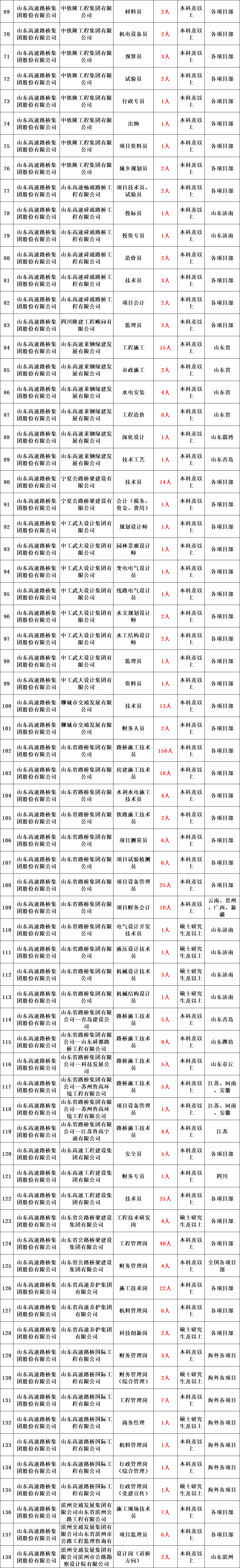 截至目前,山东高速集团运营管理高速公路7779.2公里,其中省内6170.4公里,占全省的82.4%;拥有山东高速(600350.SH)、山东路桥(000498.SZ)、山高控股(412.HK)、齐鲁高速(1576.HK)、威海银行(9677.HK)、山高新能源(1250.HK)6家上市公司;获评国内AAA级和国际A级信用评级,入选“世界企业500强”。根据业务发展和工作需要,现公开招聘优秀人才。