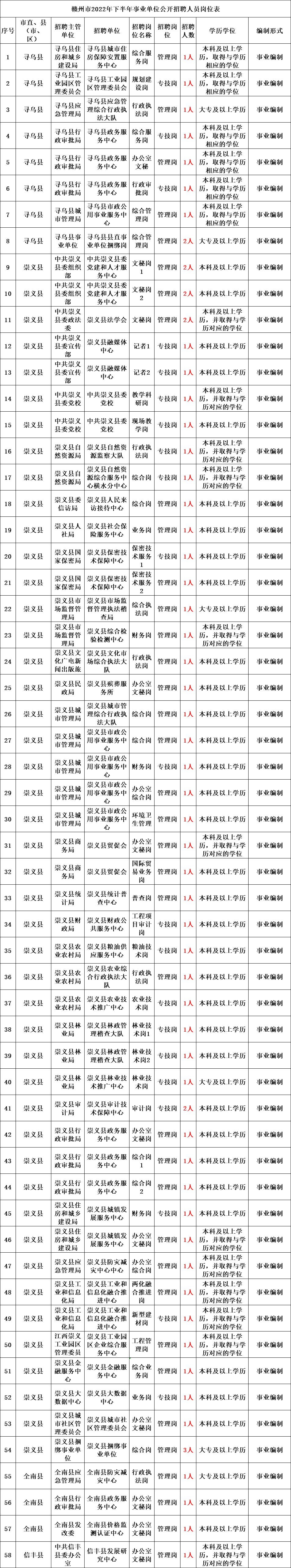 本次招聘共计482个岗位、588个计划,具体招聘岗位、条件及招聘人数详见《赣州市2022年下半年事业单位公开招聘人员岗位表》。