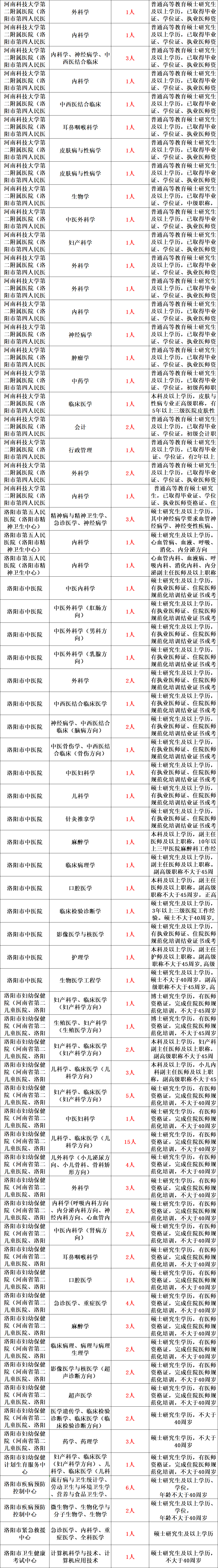详见《2022年洛阳市卫生健康委员会所属事业单位招才引智职位表》(附件1)。