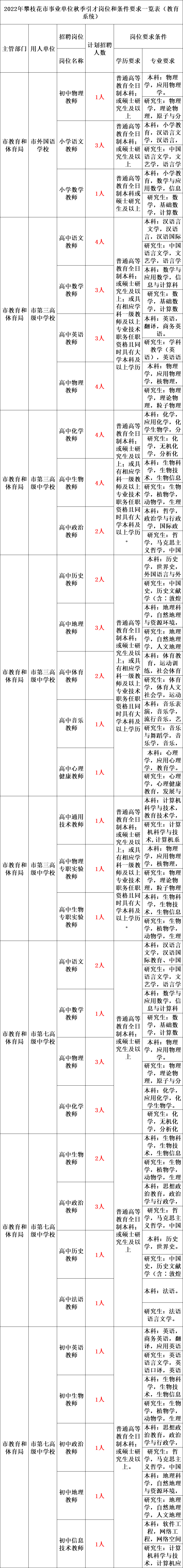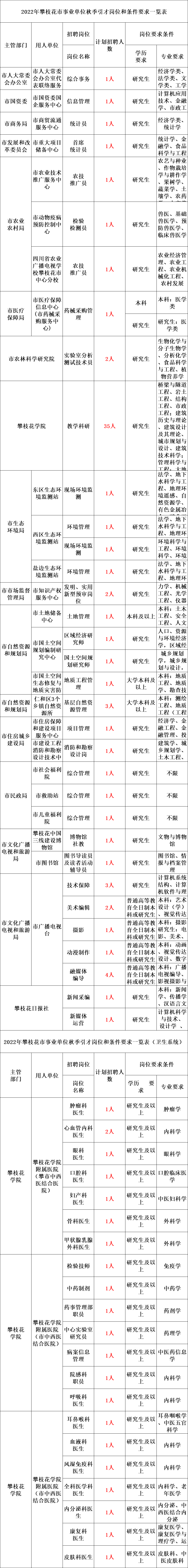 招聘具体岗位要求、条件及报名考核程序请登陆智联招聘官网、攀西人才网(www.pxrc.com.cn) 查询;报名免收报名费。