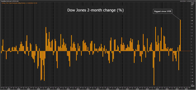 截止收盘,道琼斯工业股票平均价格指数在周三上涨737.24点,至34589.77点,涨幅2.2%。根据道琼斯的数据显示,道指过去两个月的百分比涨幅是1938年7月以来最大的。