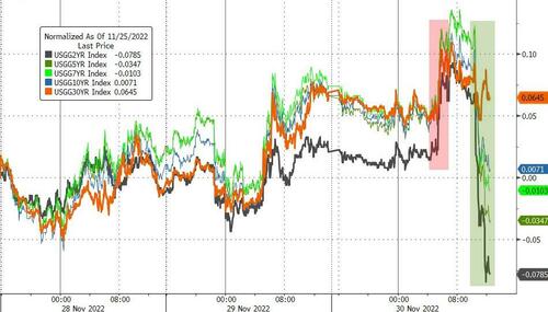 在整个11月,有着全球资产定价之锚的10年期美债收益率累计下跌了约44个基点,在连升三个月后回落。与短期利率关联更为紧密的2年期美债收益率则下跌了约17个基点,回吐了10月的多数升幅。