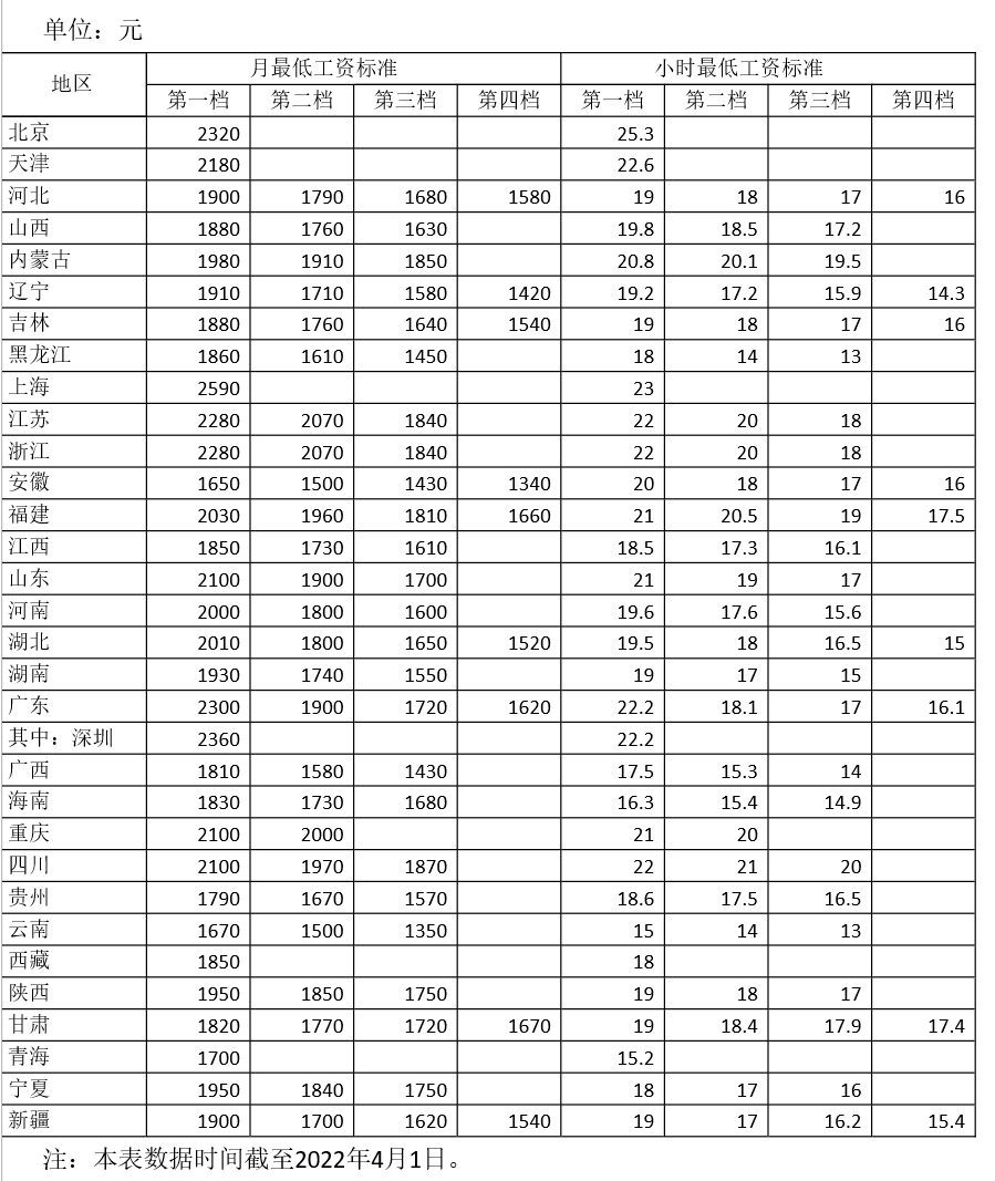 与全国各地区最低工资标准情况(截至2022年4月1日)对比发现,河北、云南等地最低工作标准上调。
