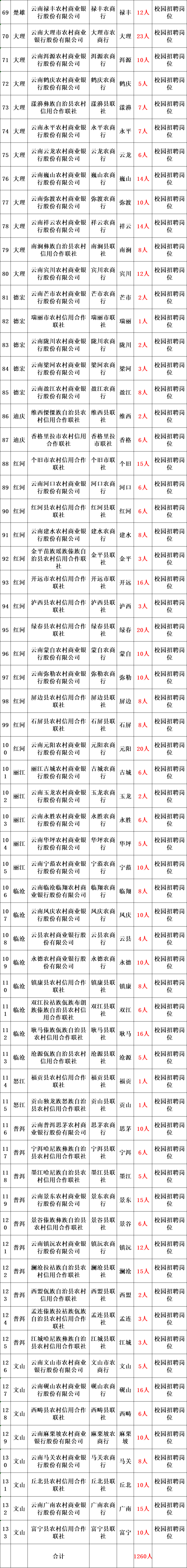 云南农信致力于打造“小而美、聚而精、品牌佳、口碑好”的现代农村商业银行,全力开创云南农信改革发展的新局面,现面向国内外院校招聘优秀高校毕业生,指标合计1260人。具体如下: