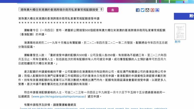 随着内地与香港逐步复常通关,两地人员往来更加便利。1月4日,香港运输署宣布重新公开接受500个经港珠澳大桥往来港澳的“香港跨境非商用私家车”常规配额的申请。