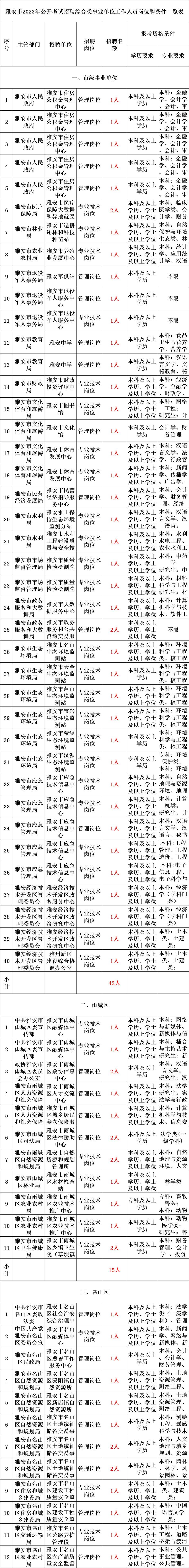 根据《雅安市事业单位公开招聘工作人员实施办法》和《雅安市事业单位公开招聘工作人员面试工作管理办法》规定,现将我市2023年度公开考试招聘综合类事业单位工作人员有关事项公告如下: