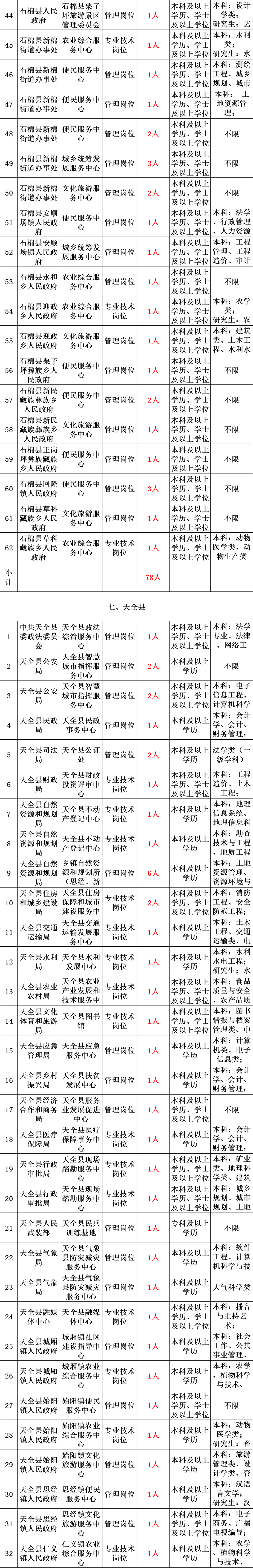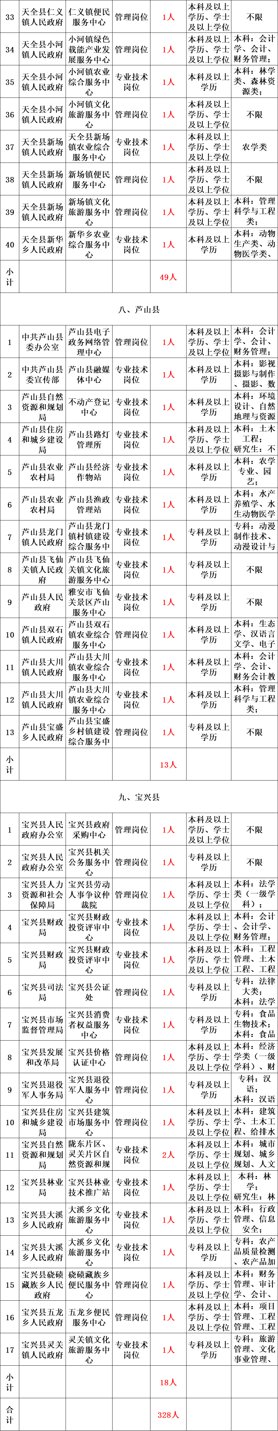 本次公开招聘综合类事业单位工作人员名额共计328名,具体招聘单位、岗位、名额及报考资格条件详见《雅安市2023年公开考试招聘综合类事业单位工作人员岗位和条件一览表》。