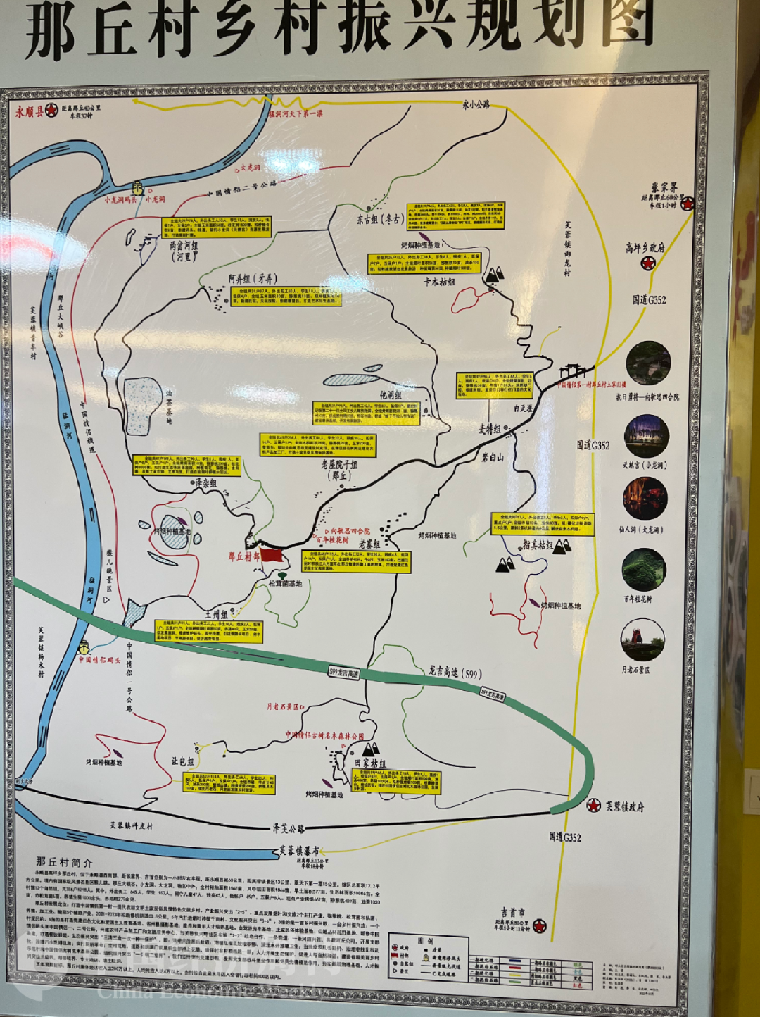 不仅是村整体规划,那丘村每个生产队未来的发展目标都非常清晰,如,两岔河组的目标是“种植荷花8亩,修建码头、栈道,依托小龙洞(天鹅宫)资源发展旅游”,阿弄组则“拟种植果木50亩,新建民宿、天坑探险,修建瞭望塔,打造艺术写生基地”。