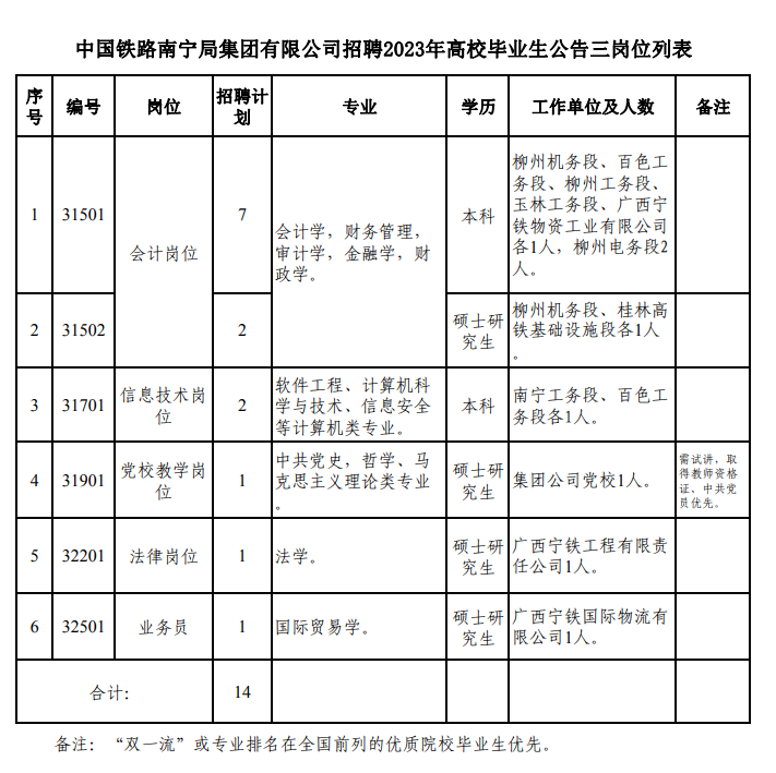 本次招聘岗位、专业、人数详见附件《中国铁路南宁局集团有限公司招聘2023年高校毕业生公告三岗位列表》。
