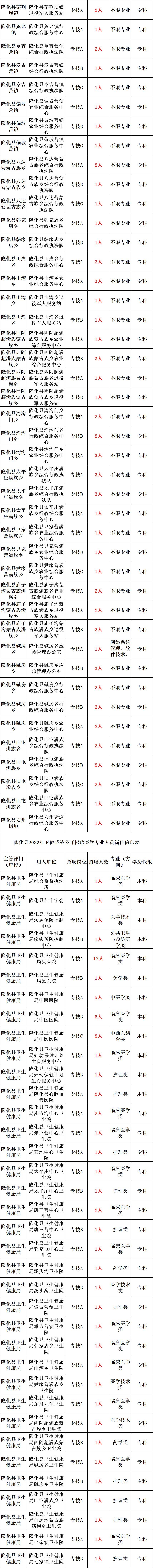 隆化县事业单位公开招聘工作人员共计261名(其中,综合类201名,医学专业类60名),具体招聘岗位、招聘人数、招聘条件等详情见附件《隆化县2022年事业单位公开招聘工作人员综合类岗位信息表》,《隆化县2022年卫健系统公开招聘医学专业人员岗位信息表》。