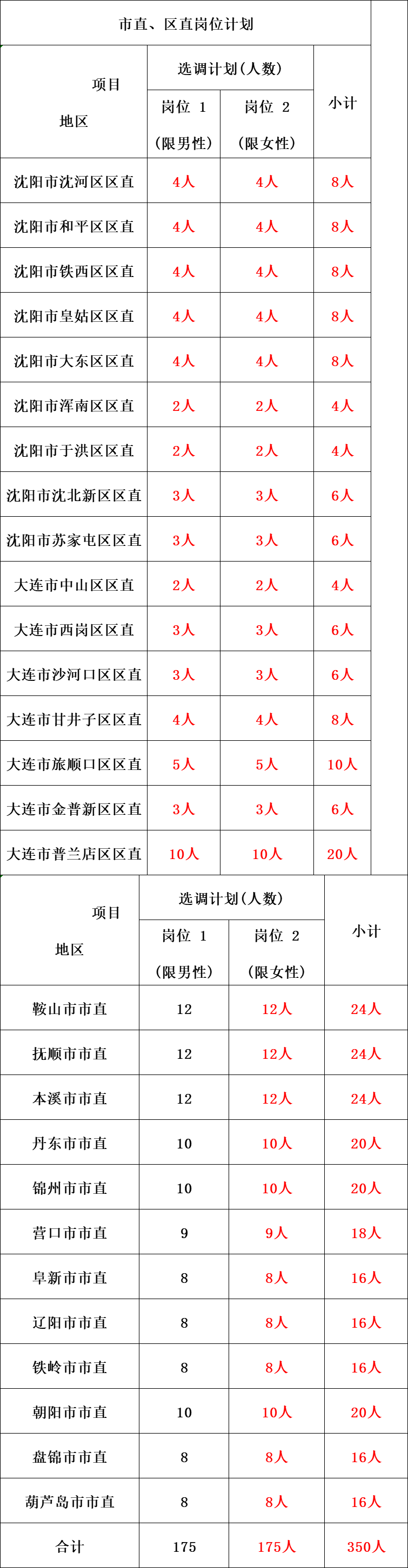 1. 沈阳市、大连市的区直单位岗位和其他12个市的市直单位岗位计划选调350名,面向部分“双一流”建设高校毕业生选调(岗位计划见附件1,选调高校见附件4中4-1)。