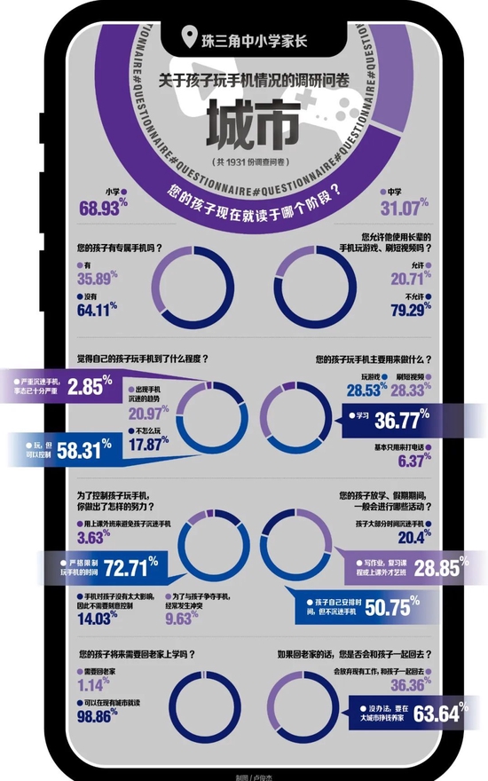 《南方人物周刊》与广东省教育系统关心下一代工作委员会的调研数据显示,城市家长对学生使用手机的管控更严格,学生手机成瘾程度更轻。