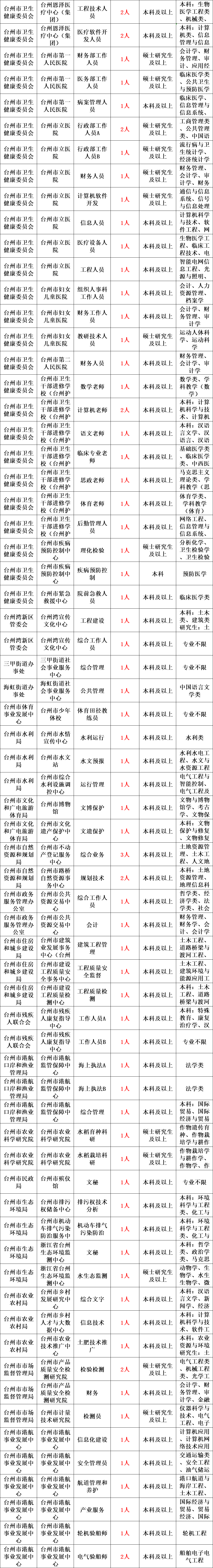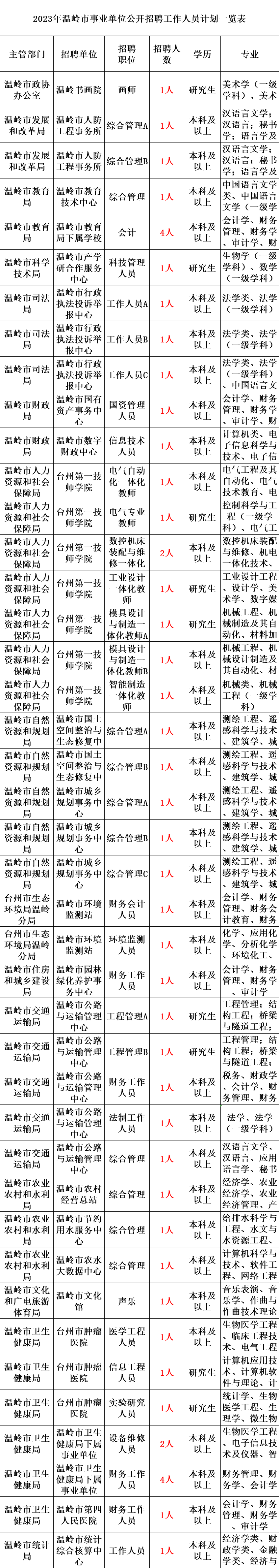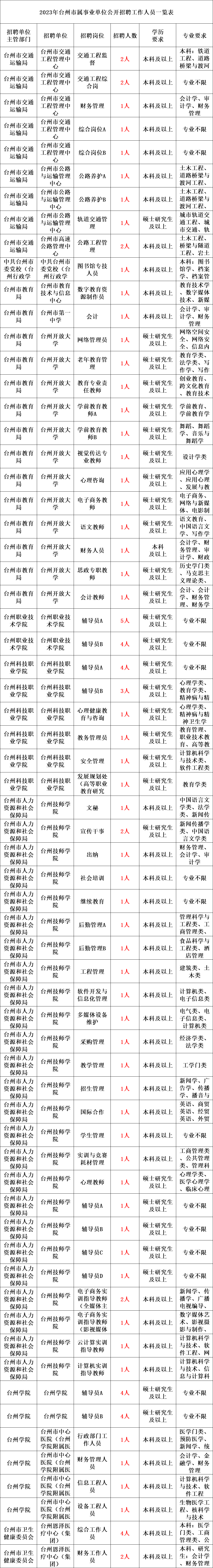 为满足市属事业单位补充工作人员的需要,根据《事业单位人事管理条例》(国务院第652号令)和《台州市事业单位公开招聘人员实施办法》(台政办发〔2008〕82号)以及台州市委组织部、台州市人力资源和社会保障局《关于进一步加强事业单位公开招聘和人员流动管理工作的实施意见》(台人社发〔2015〕107号)等有关规定,现将2023年台州市属部分事业单位公开招聘人员有关事项公告如下点:
