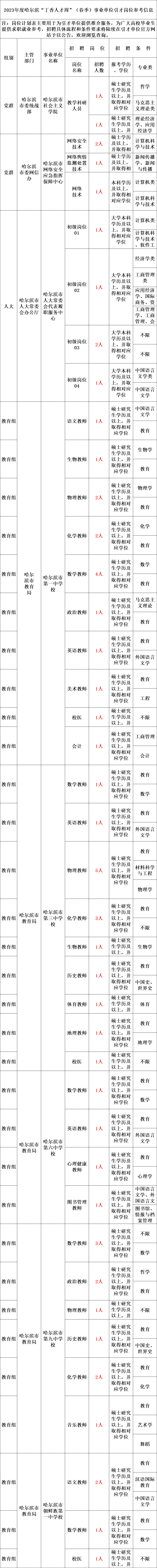 按照《关于印发黑龙江省事业单位公开招聘工作人员实施细则的通知》(黑人社发〔2014〕63号)和《2023年度哈尔滨“丁香人才周”(春季)活动实施方案》精神,组织开展2023年度哈尔滨“丁香人才周”(春季)事业单位引才招聘工作。现将有关事项公告如下: