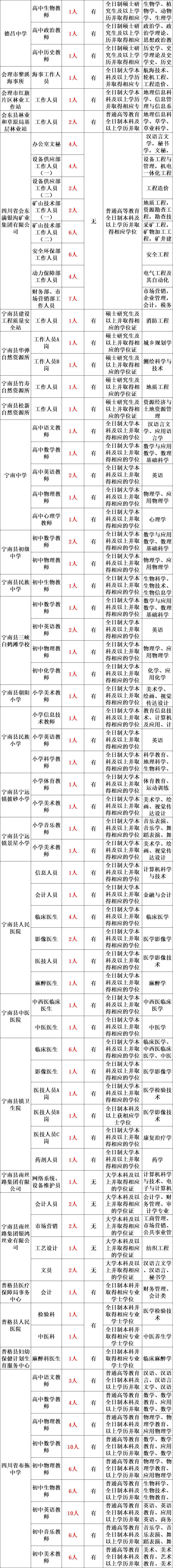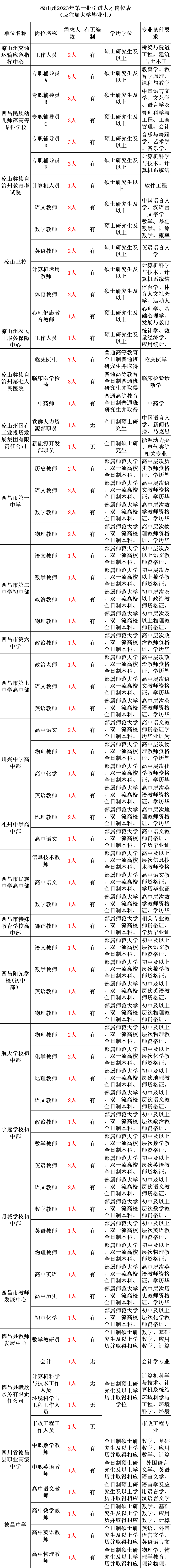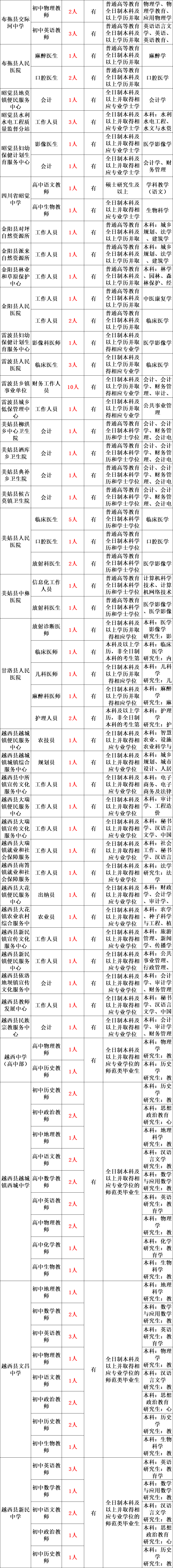 具体岗位详见四川省人力资源和社会保障厅人事考试专栏(http://202.61.89.231/index.aspx)、凉山州人力资源和社会保障局人事考试专栏(http://rsj.lsz.gov.cn/),并可登录昆明理工大学、重庆大学、西南医科大学等院校的官方招生就业网站查询相关宣传推介活动。