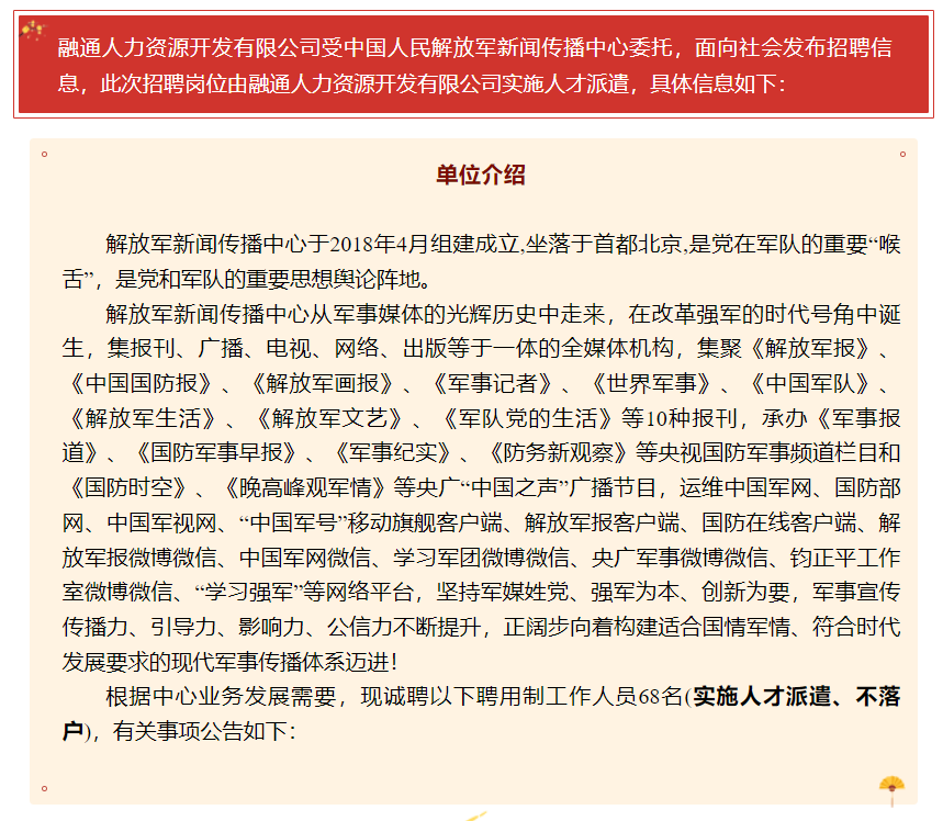 中国人民解放军新闻传播中心公开招聘68名工作人员公告