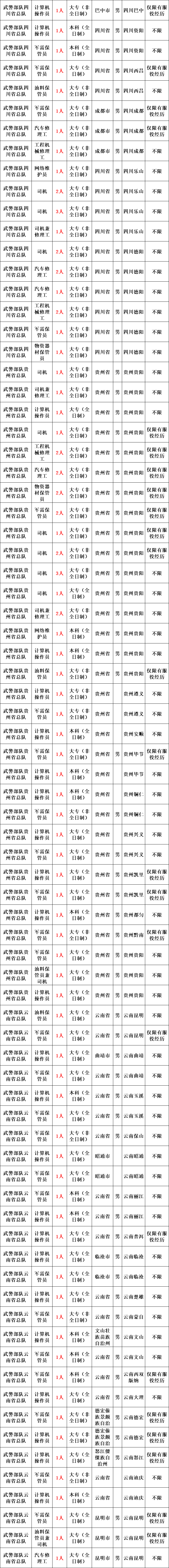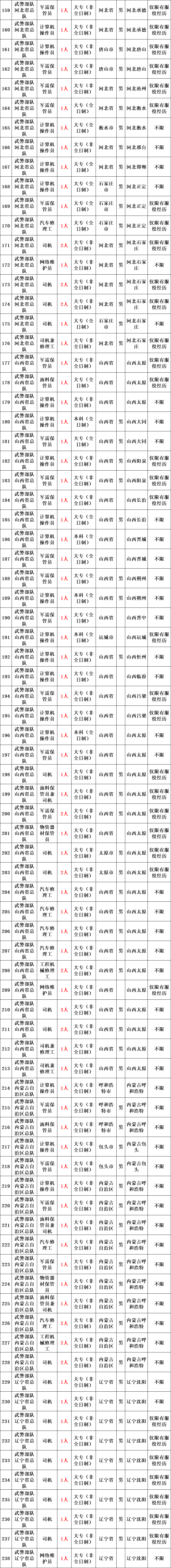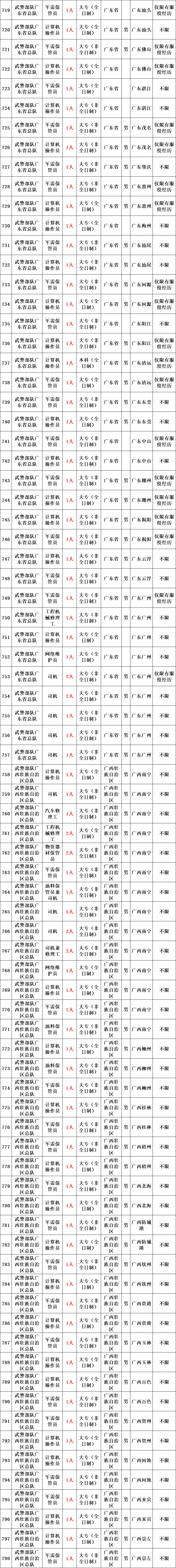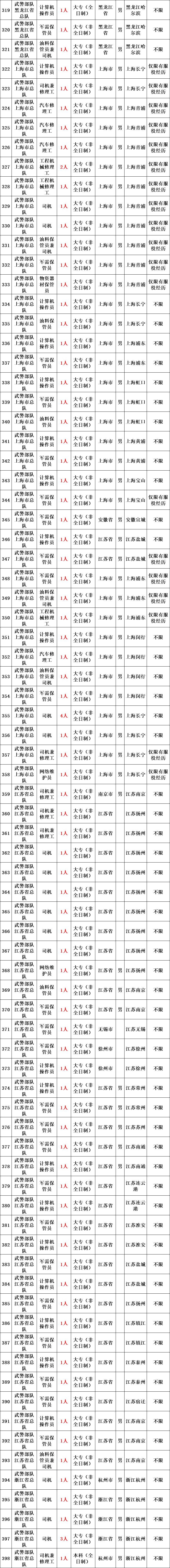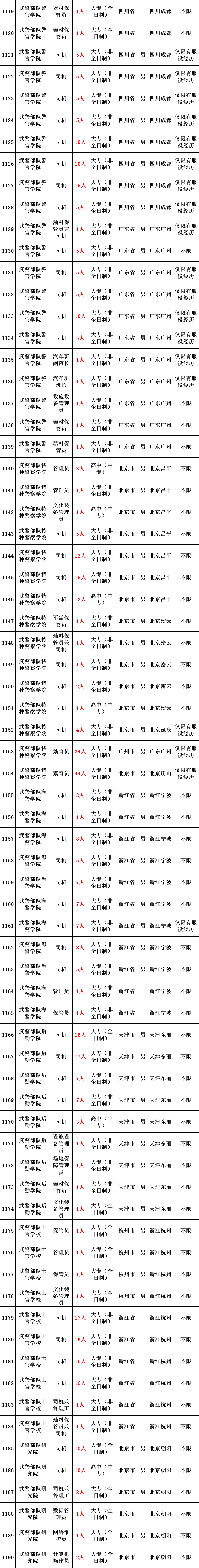 武警部队所属用人单位运输投送、装备维修、物资器材储存、军犬繁育、信息通信等专业技能三级以下文职人员岗位。