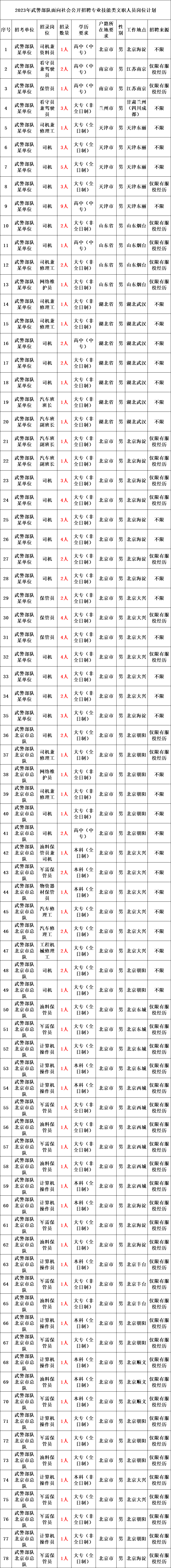根据《军队专业技能岗位文职人员聘用管理暂行规定》及有关政策规定,现就2023年武警部队面向社会公开招聘专业技能类文职人员有关事项公告如下: