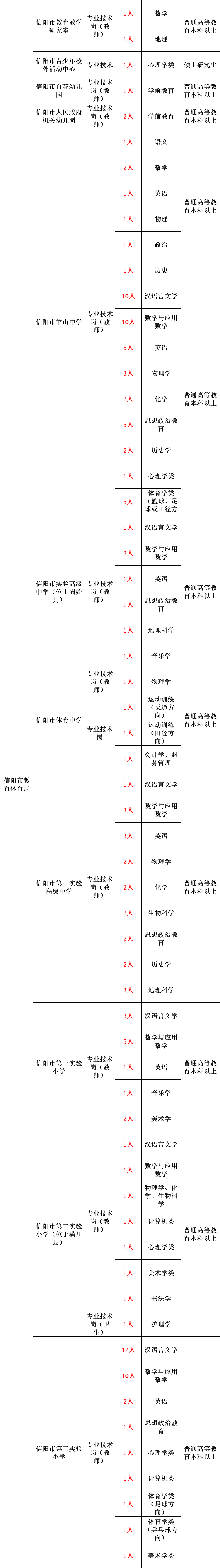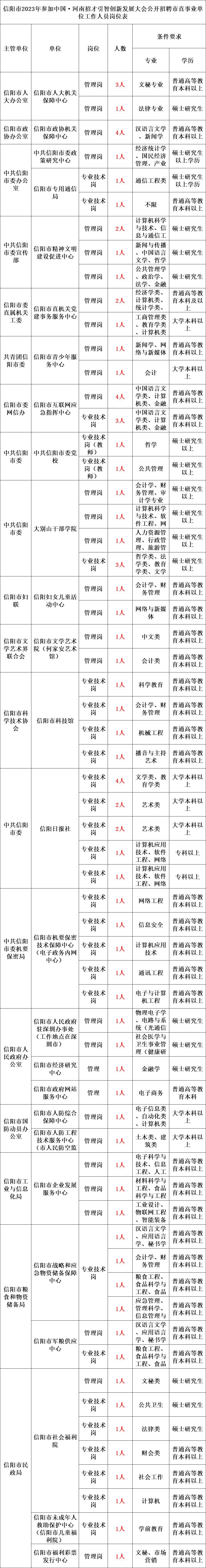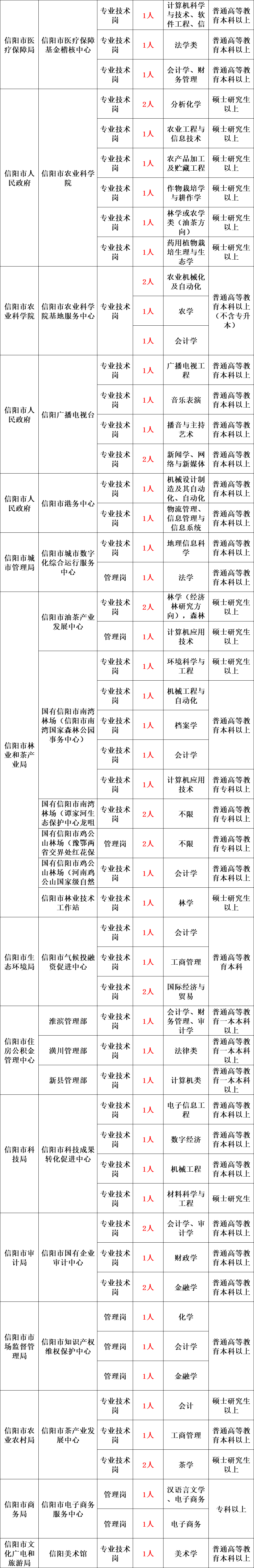 根据《事业单位公开招聘人员暂行规定》(人事部〔2005〕6号令)、《河南省事业单位公开招聘工作规程》(豫人社〔2015〕55号),信阳市市直和豫东南高新区所属事业单位面向社会公开招聘工作人员590名,现将有关事项公告如下。