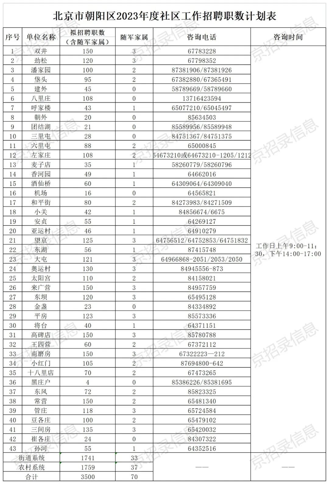 本次公开招聘涉及43个街道(地区)办事处,计划招聘3500名(含随军家属70名)社区工作者(详见附件1)。